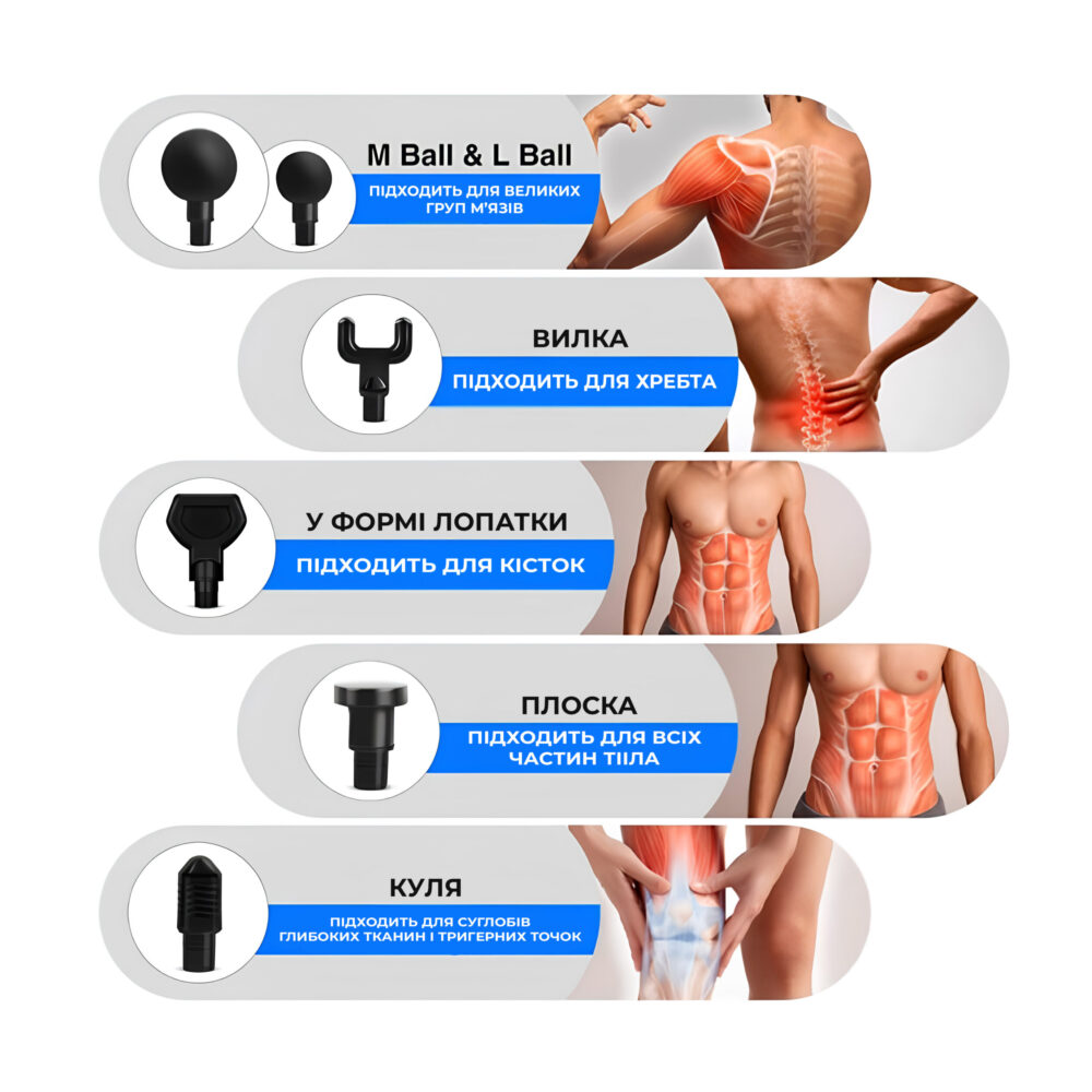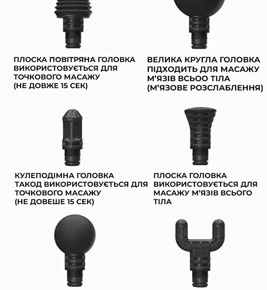 - Ефективне відновлення: Використання змінних насадок дозволяє адаптувати масаж під індивідуальні потреби, сприяючи швидкому відновленню після фізичних навантажень та зменшуючи ризик травм.