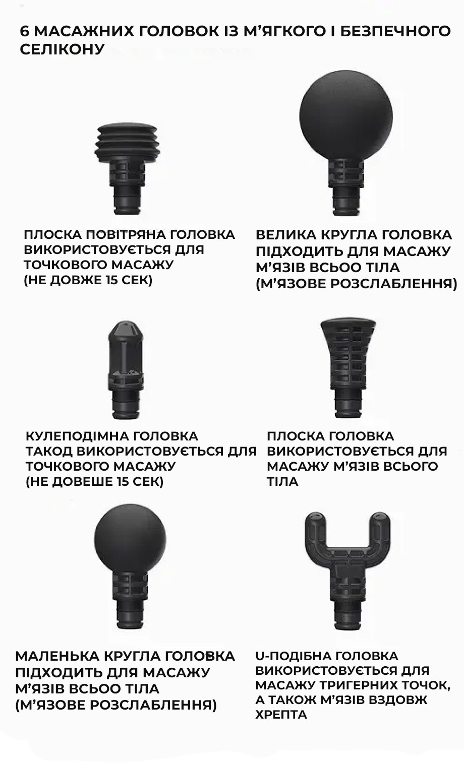 - Ефективне відновлення: Використання змінних насадок дозволяє адаптувати масаж під індивідуальні потреби, сприяючи швидкому відновленню після фізичних навантажень та зменшуючи ризик травм.