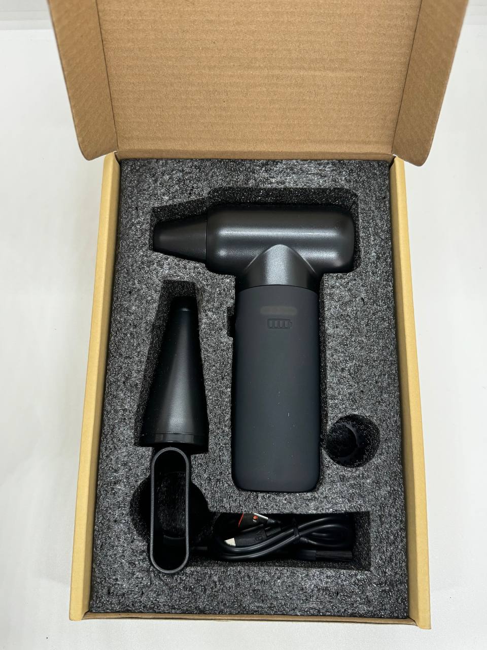 Turbo Air Blaster працює від вбудованого акумулятора ємністю 2000 mAh (11,1V), що дозволяє використовувати його будь-де. Заряджання відбувається через зручний роз’єм USB Type-C — швидко та сучасно.